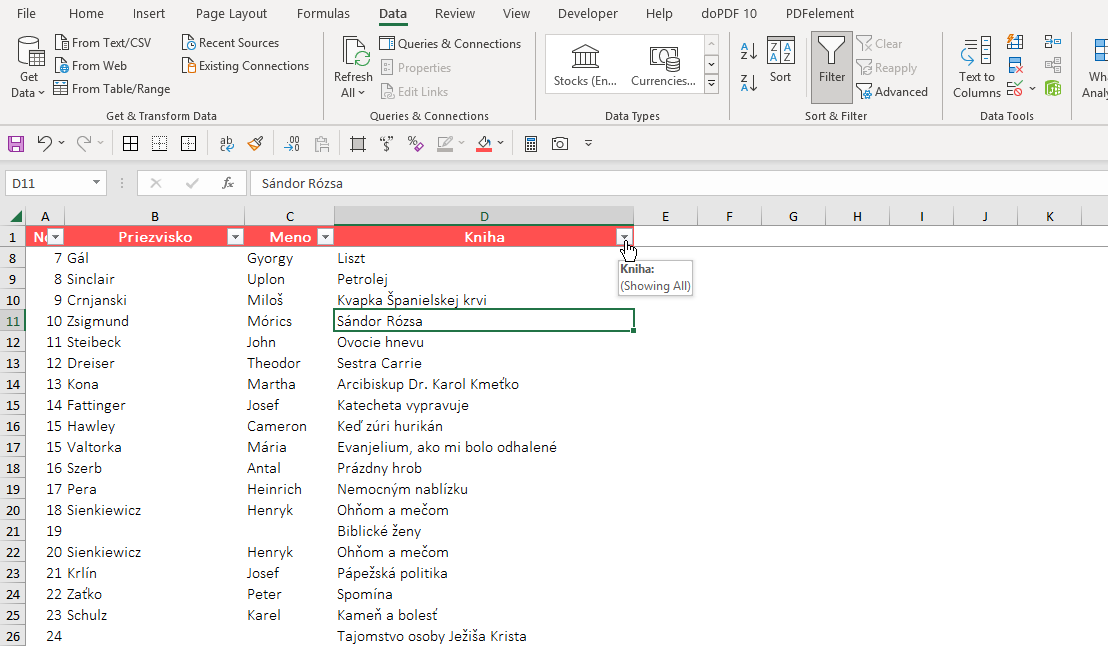 V našom príklade sme napríklad filtrovali nad celou tabuľkou databázy kníh, kde sme potrebovali vyfiltrovať len riadky, v ktorých sa v stĺpci C nachádza meno „Henryk“.