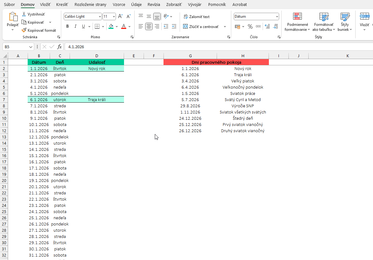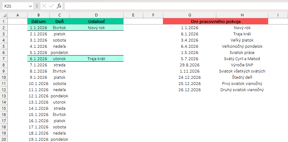 Budeme vychádzať len z 3 jednoduchých stĺpcov – dátum, deň v týždni a názov sviatku/udalosti a teda stĺpce B, C a D. V stĺpci G si zaznačíme len dátumy sviatkov – dni pracovného pokoja. Našim cieľom je, aby sa riadky v stĺpcoch B, C a D podfarbovali podľa hodnôt v stĺpci G.