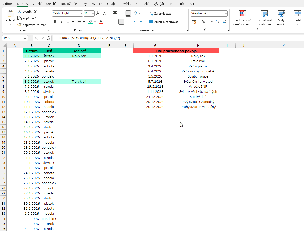V stĺpci D si necháme doplniť názov Dňa pracovného pokoja zo stĺpca H za pomoci funkcie VLOOKUP a IFERROR: